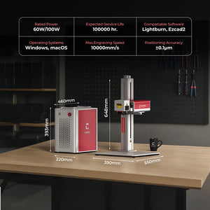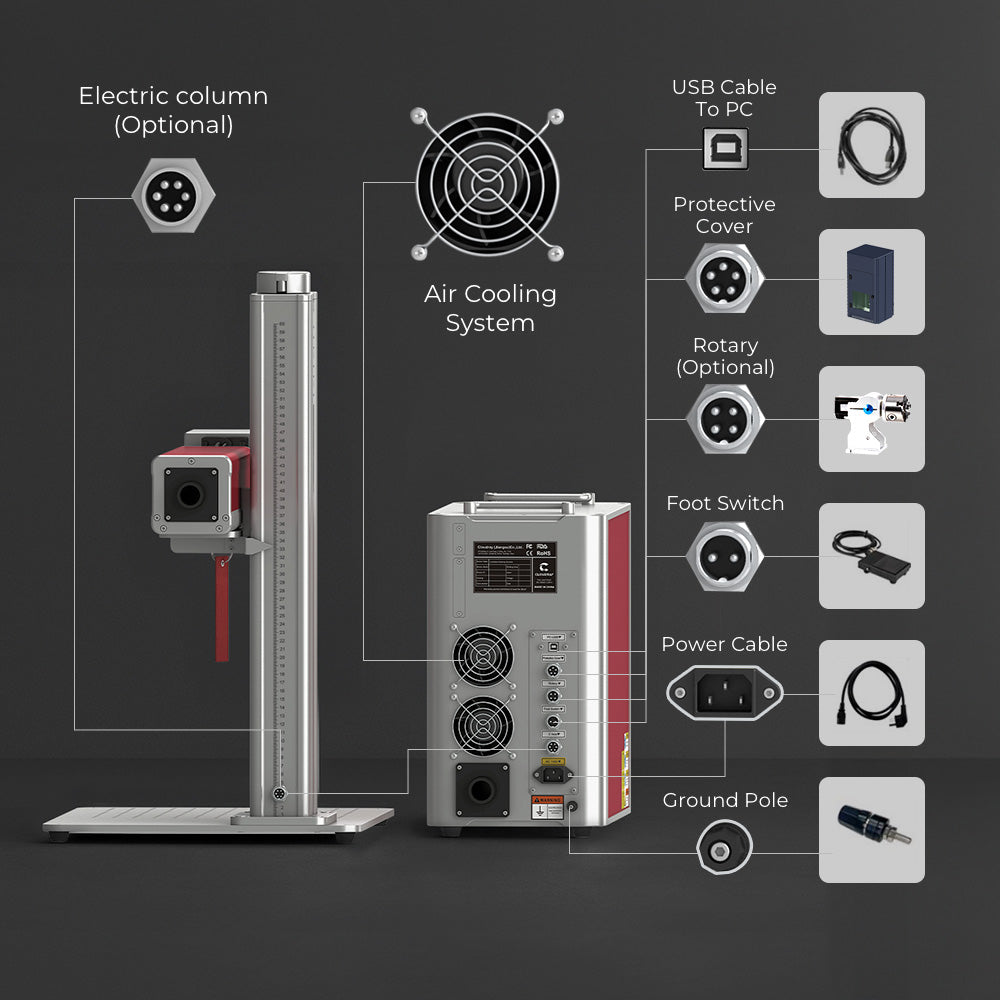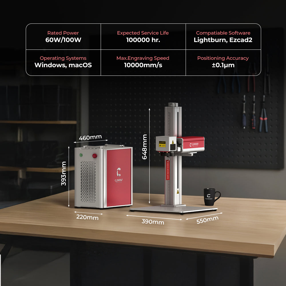Casa Grabador láser de fibra Cloudray MP Series Neo 60W 100W con enfoque automático Mopa, columna de elevación eléctrica y cabezal rotatorio D80