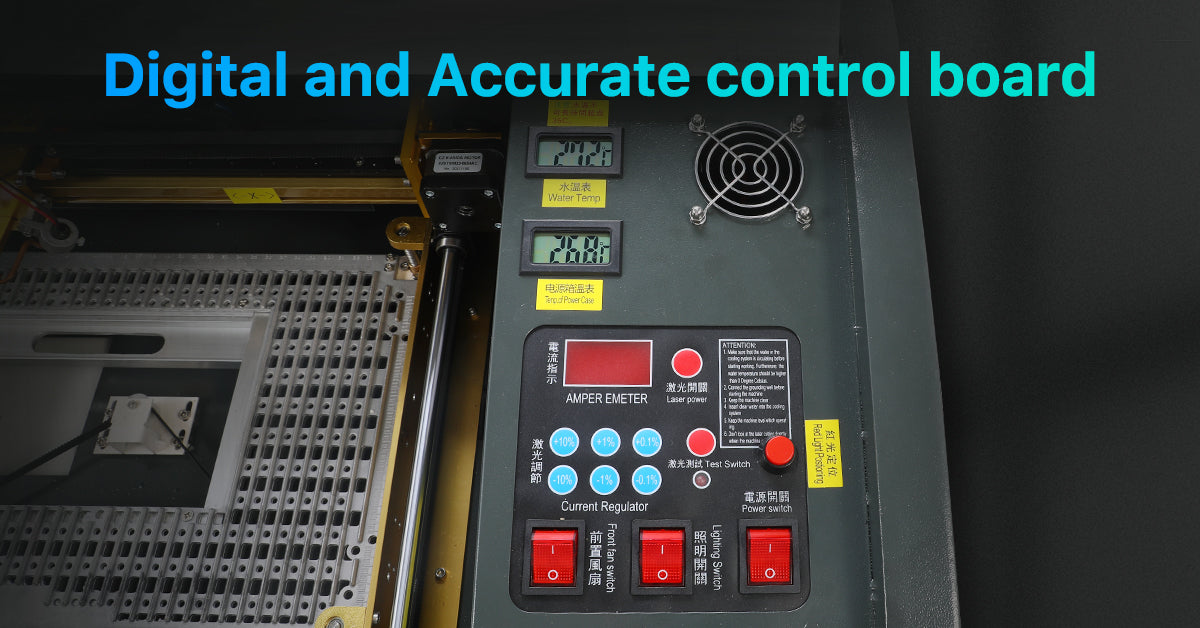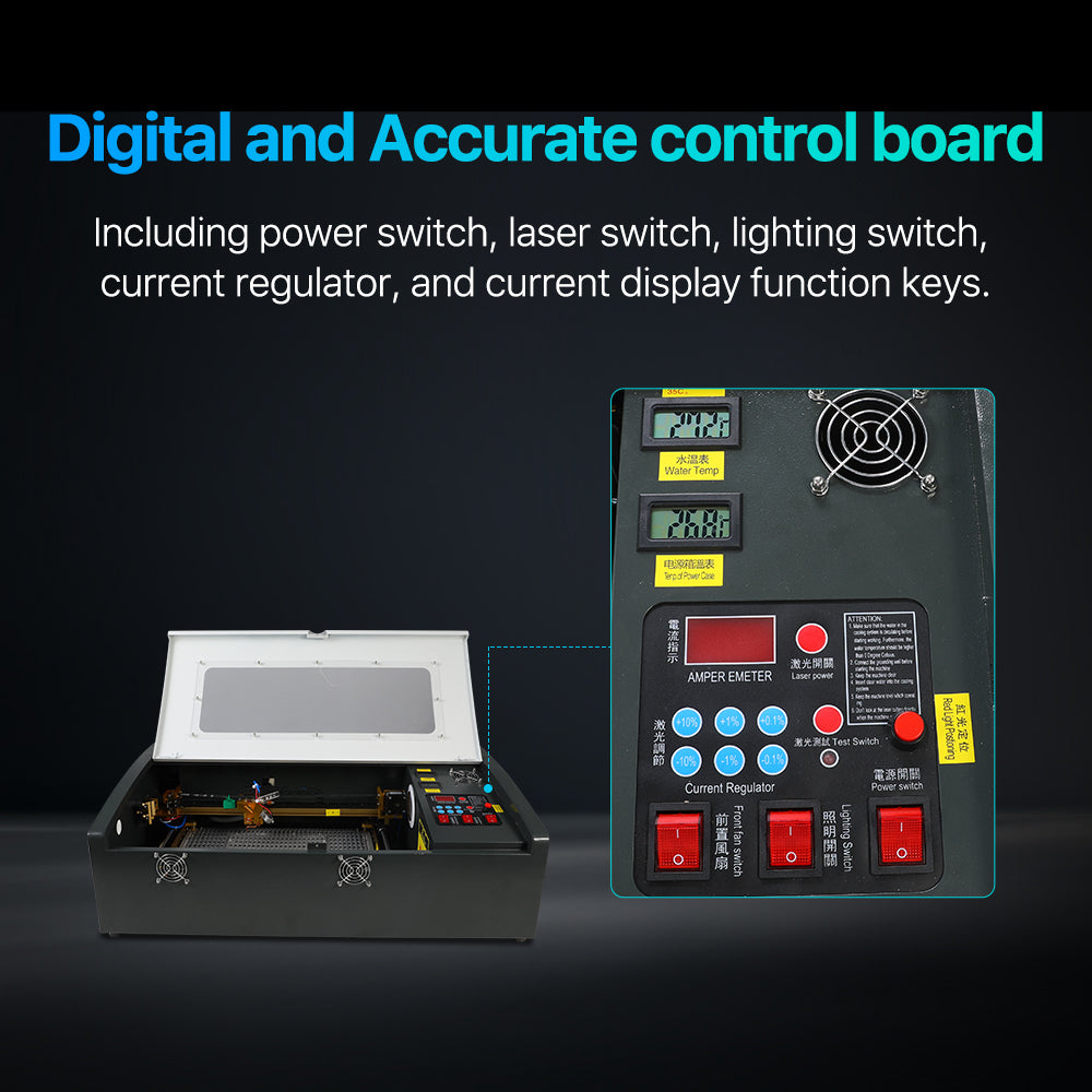 L'amperometro digitale e il display della temperatura della fresa consentono un controllo preciso della potenza e del monitoraggio della temperatura per garantire la qualità dell'incisione ed evitare il surriscaldamento, il che aumenta la longevità del dispositivo e migliora l'esperienza dell'utente.