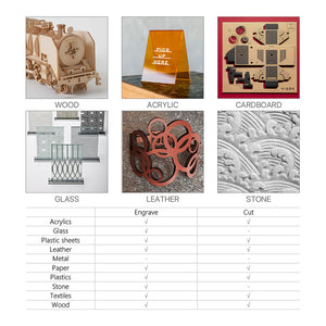 - Può incidere o tagliare in sicurezza qualsiasi materiale compatibile con il laser